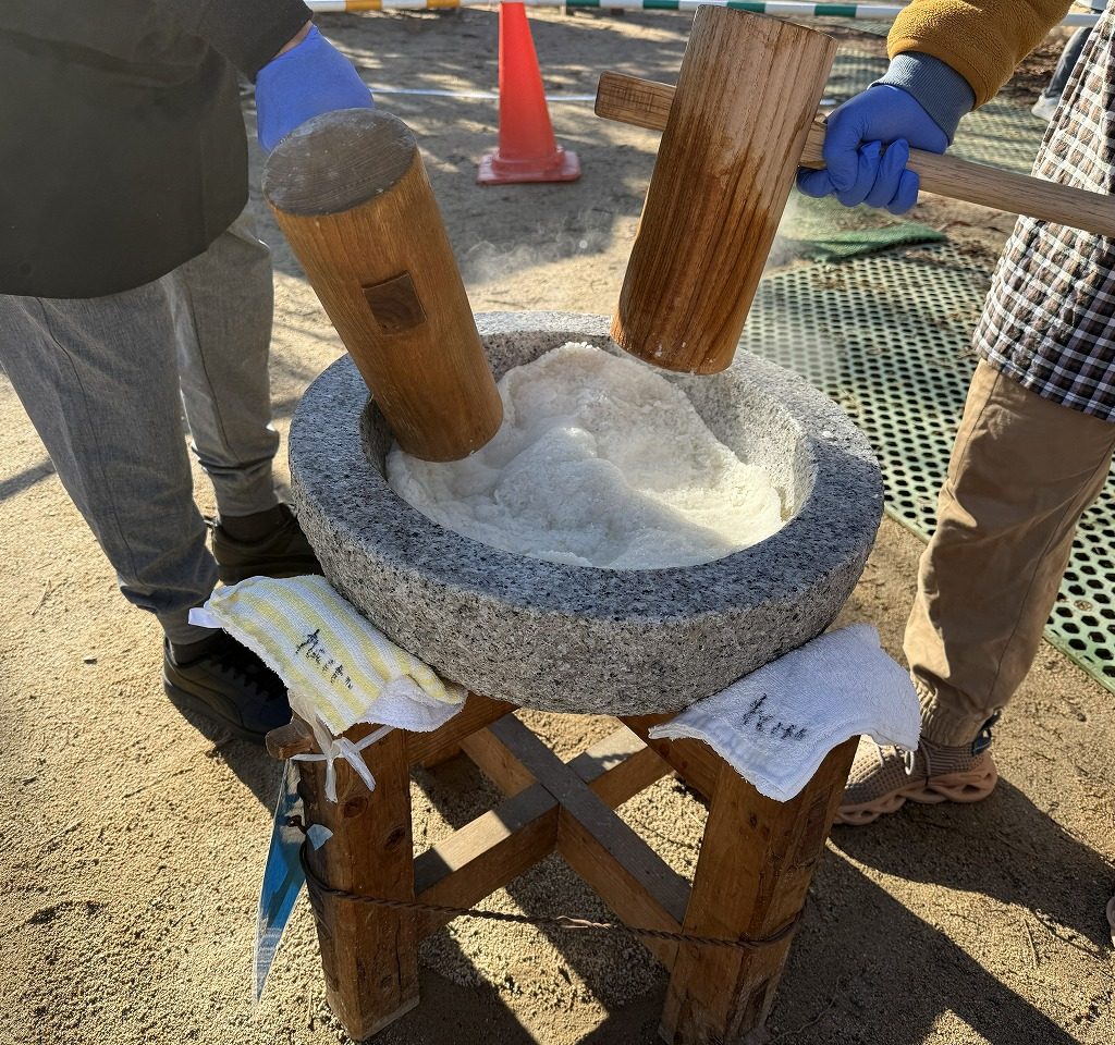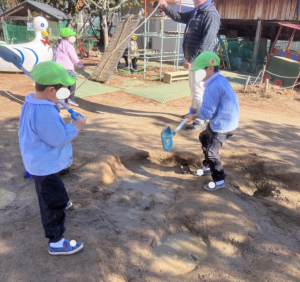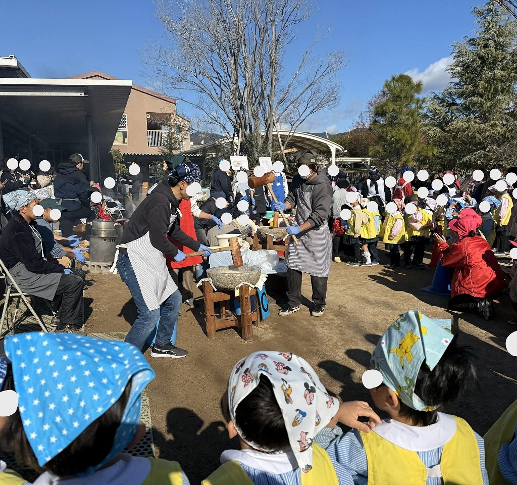 おもちつきの後には園庭のどろんこ広場でおもちつきをする年長の姿もありました。こういった実体験が遊びに繋がり、子どもたちの新たな遊びに発展していきます!