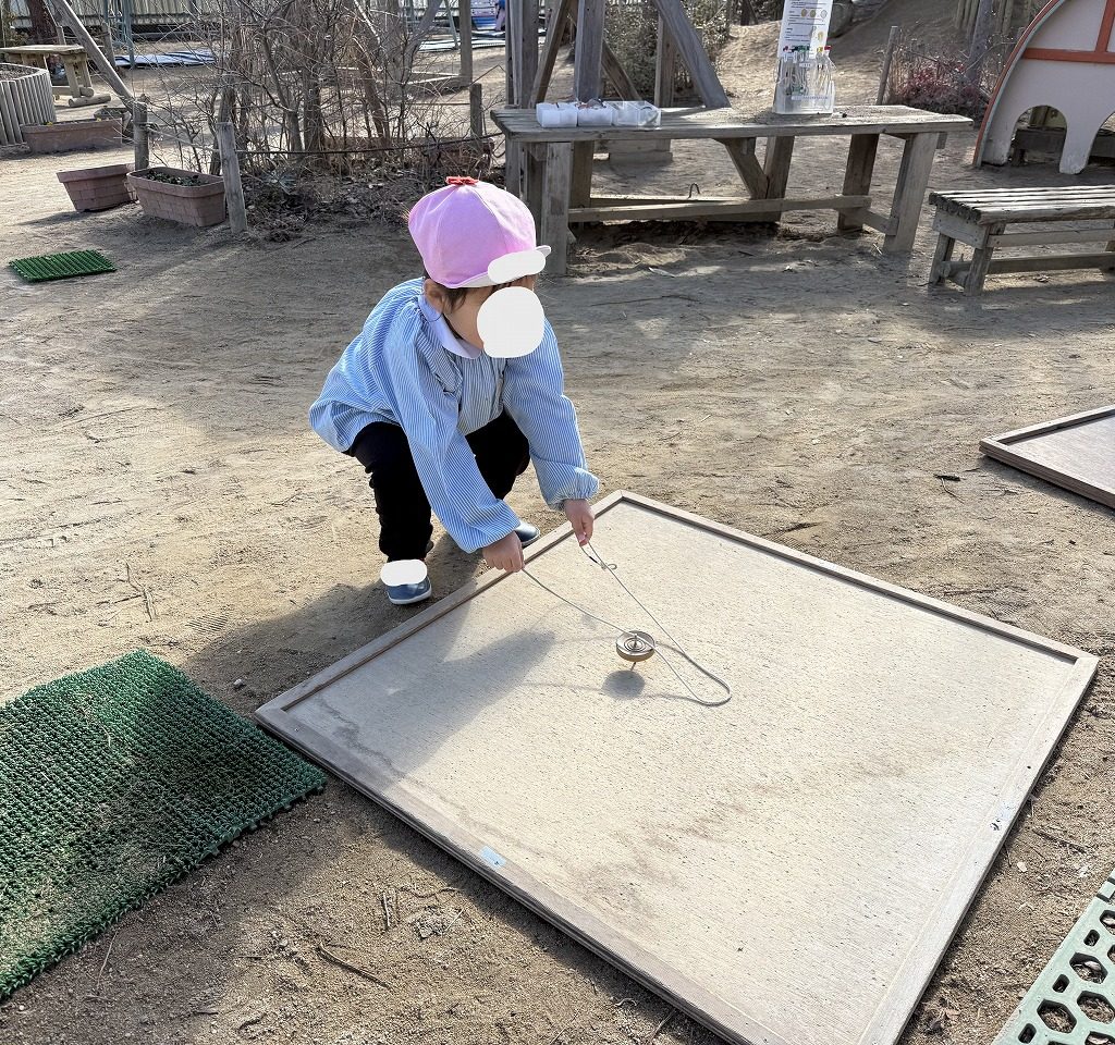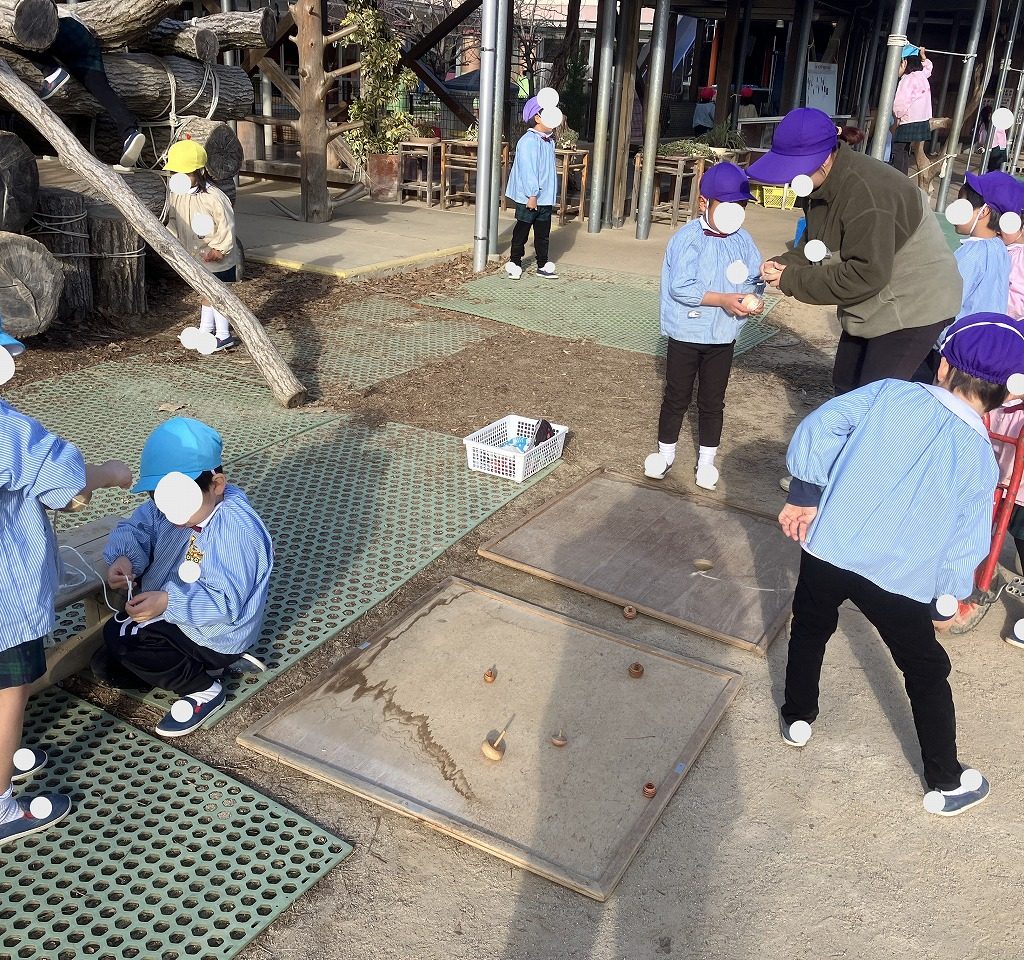 先日、年長全クラスで【こままわし大会】を行いました!2学期終業式にお年玉として園からもらった鉄心ごまでの勝負です。