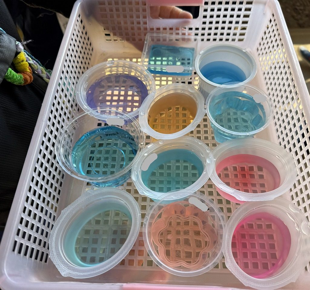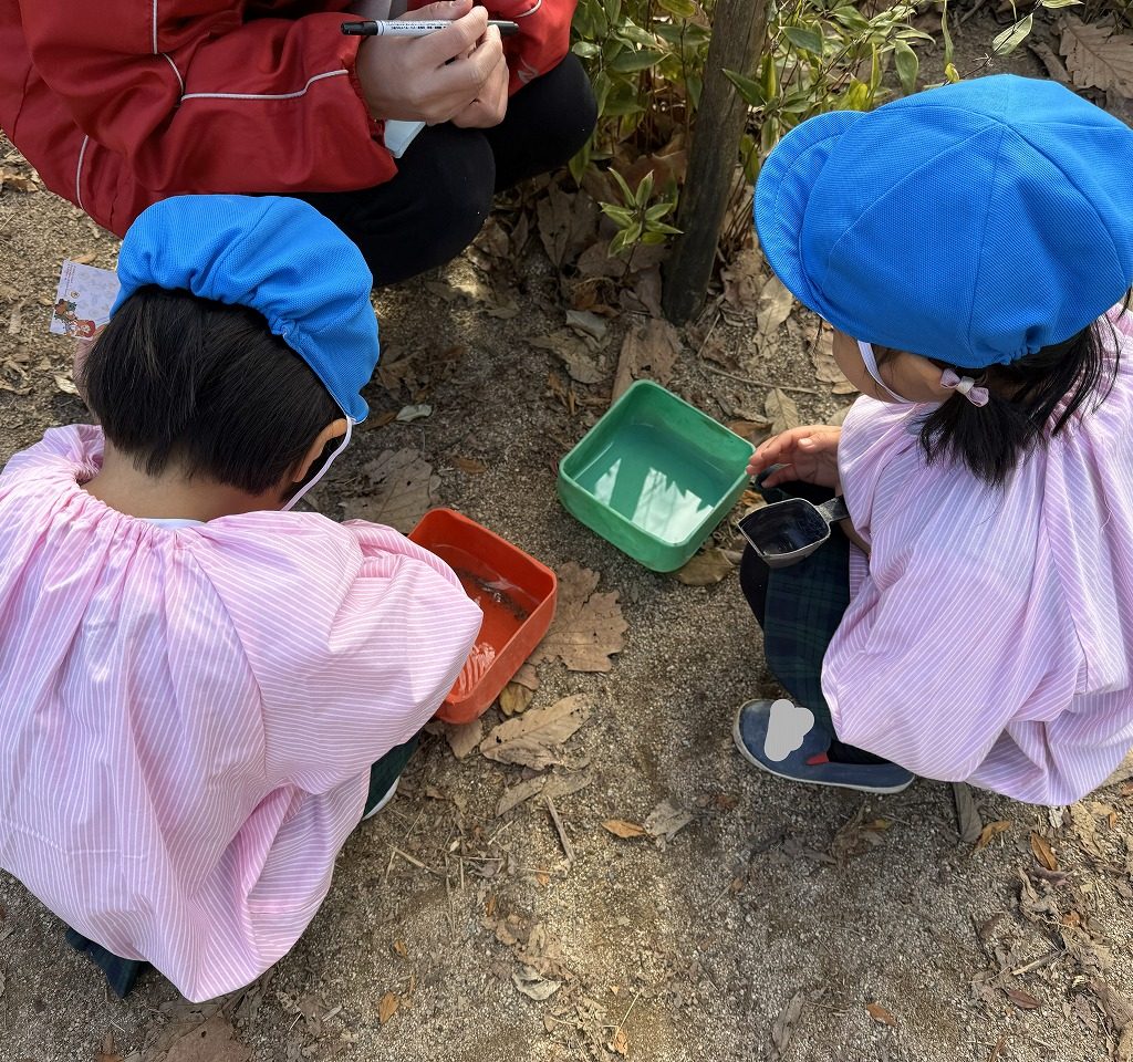 1月に入り、気温もグッと下がりようやく冬らしい季節になってきました。「口から白いの出てる!」と息の白さに驚いたり「氷できるかな?」と楽しみにしながら置く場所を考えたり、水に色を付けたり冬らしい遊びを楽しんでいます♪