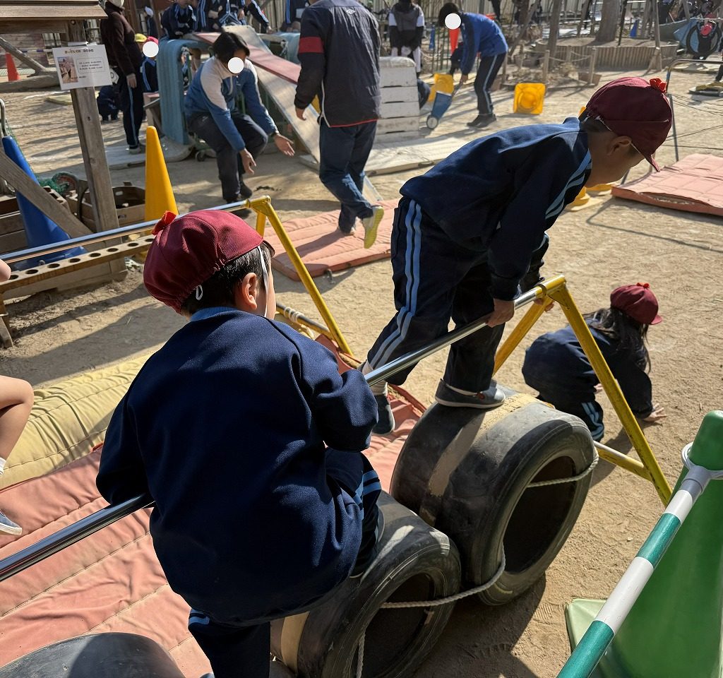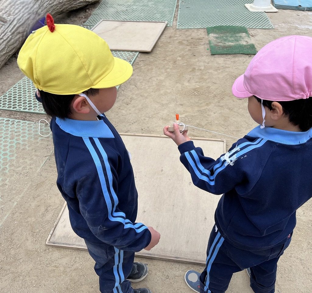 3学期に入ってからより異年齢での関わりが増えてきました。同じコースでなくても自然と同じ遊びに興味を持った子ども同士が集まり盛り上がっています。また大繩やこま回しでは他学年の姿を見て[「やりたい!」と子どもたちなりにチャレンジしています!