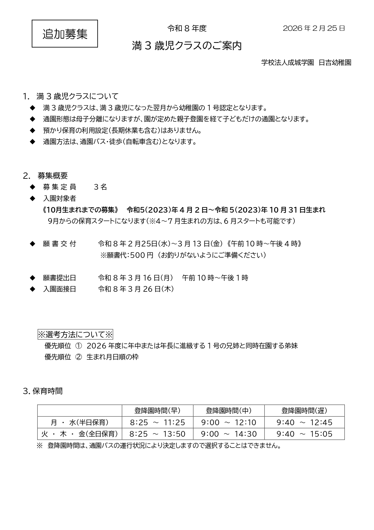 令和8年度 満3歳児クラスの追加募集をいたします。
